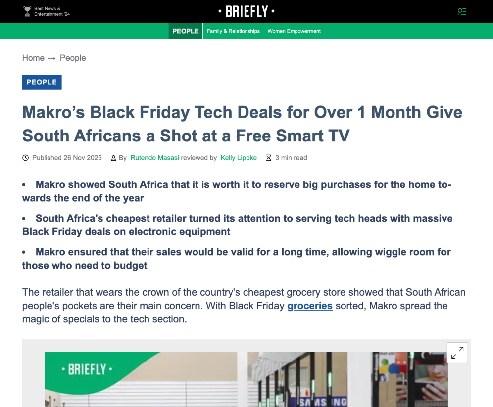 In November–December 2025, Briefly News partnered with Massmart brands — Makro and Game — to deliver a full-funnel digital campaign aimed at driving national awareness, engagement, and deal consideration during the most competitive retail period of the year.